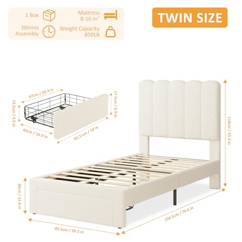 GarveeHome Twin Bed Frame with Under-Bed Drawer, Upholstered Platform Bed with Wave Headboard for Kids/Girls, Wooden Slats Support, No Box Spring Needed, Boucle Beige
