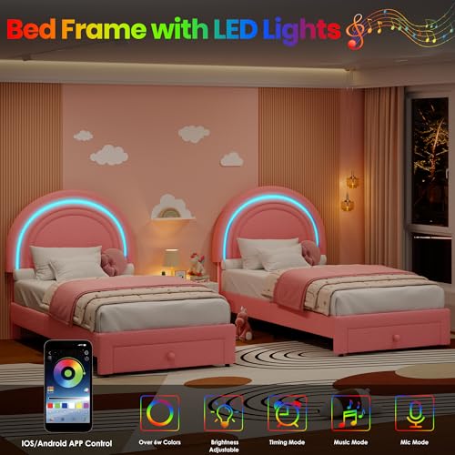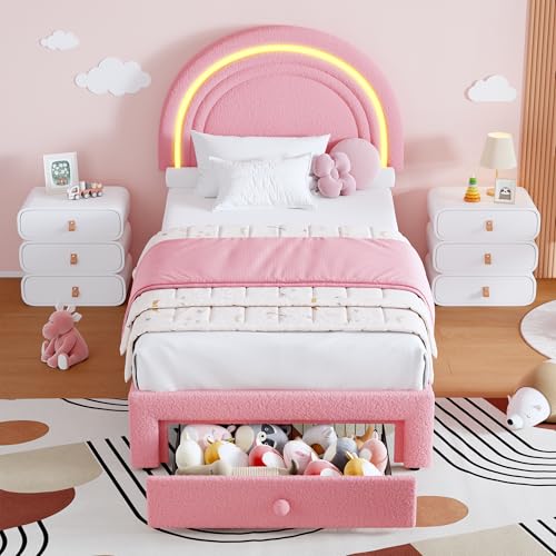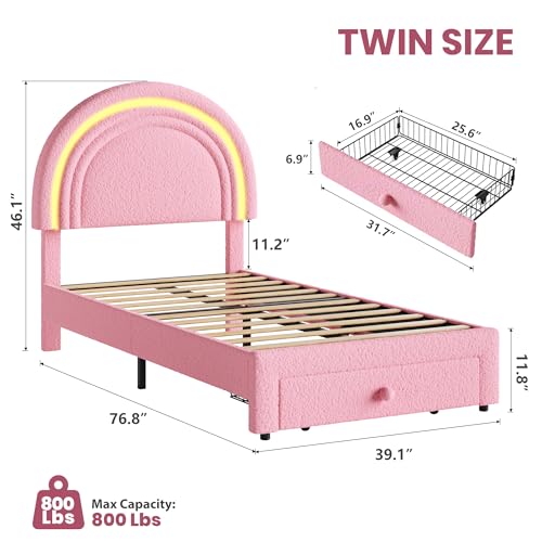 Specification: GarveeHome Twin Upholstered LED Bed Frame – with Storage Drawer and Rainbow Headboard, Berber Fleece Princess Platform Bed for Kids, Solid Wood Slats Support, No Box Spring Needed, Easy Assembly, Pink