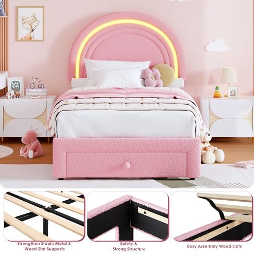 GarveeHome Twin Upholstered LED Bed Frame – with Storage Drawer and Rainbow Headboard, Berber Fleece Princess Platform Bed for Kids, Solid Wood Slats Support, No Box Spring Needed, Easy Assembly, Pink
