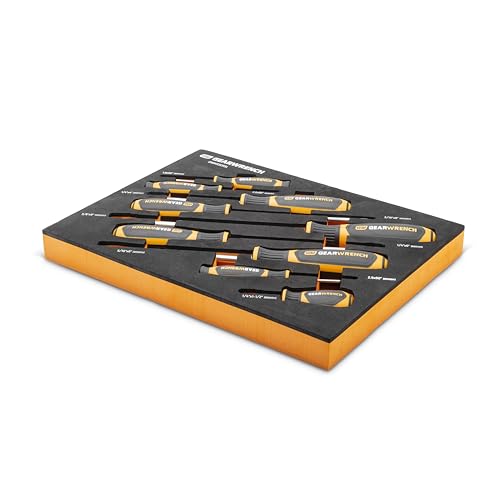 GEARWRENCH mechanics tools have been designed with professional users in mind for better productivity, access, and strength. The 9 piece slotted dual material screwdriver set in a foam storage tray is one of the wide collection of GEARWRENCH Modular Sets. These chemical and solvent resistant foam trays are designed to fit in a wide range of tool storage systems, including our GSX storage line of products. The foams are in contrasting orange and black with high visibility size markings for easy tool identification. Each of the tools fits in a custom cutout that provides optimal protection, organization, and accessibility.