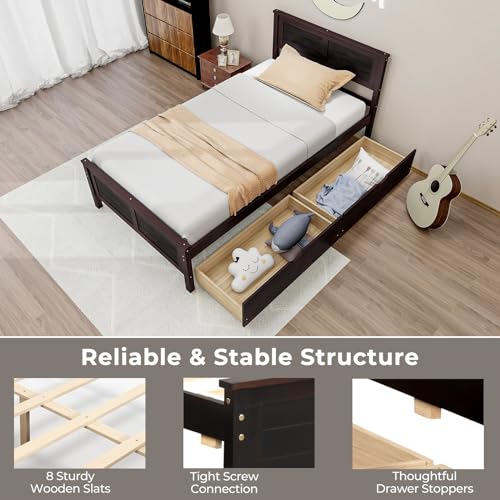 Giantex Wood Twin Bed with 2 Storage Drawers, Solid Wood Platform Bed with Headboard, Wooden Slats Support Mattress Foundation, No Spring Needed, Twin Bed Frame for Kids, Teens, Adults, Espresso