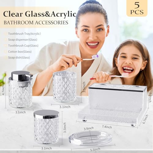 Glass Bathroom Accessories Set 5Pcs Crystal – Foaming Soap Dispenser, Soap Dish, Cup, Acrylic Toothbrush Holder with Tray Organizer, Qtip Jar, Bathroom Counter Set Sink Decor (Clear)