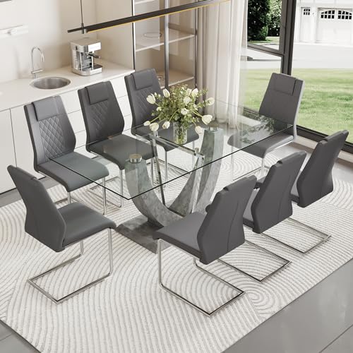 【Modern Dining Table Set】: Dining table set includes 1 x dining table and 8 x PU dining chairs. The simple dining table and PU dining chairs are perfect for family dinners and friends gatherings. The glass dining table set creates a stylish and cozy dining environment.