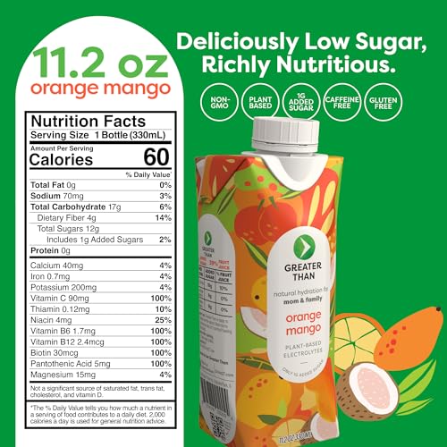 Specification: Greater Than Nutrient Hydration Beverage, Electrolyte Drink for Gut Health & Energy with Coconut Water, Vitamins, Gluten Free, Plant Based, Low Sugar, Orange Mango, 24 Pack