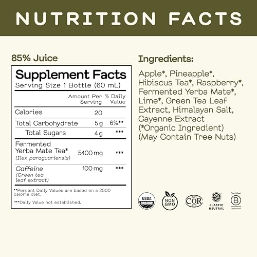 INGREDIENTS: Organic apple, organic raspberry, organic fermented yerba mate, organic lime, green tea leaf extract, himalayan salt, and cayenne extract.