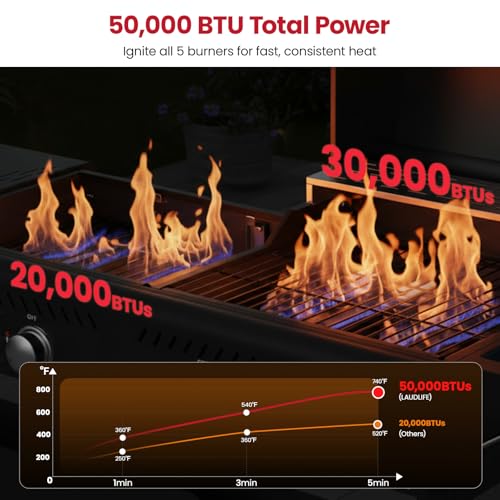 [50,000 BTUs with Piezo Ignition] High-performance 5 burners deliver up to 50,000 BTUs. With instant piezo ignition and smooth flame control, you get fast heat-up and precise temps for anything from searing to simmering.