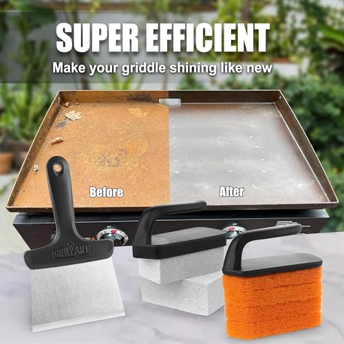 Specification: GRILLART Griddle Cleaning Kit for Blackstone, Flat Top Grill Cleaning Kit with Grill Stone, Griddle Scraper, Scouring Pad and Handles, Multifunctional Griddle Accessories for Rusty Grills, Orange