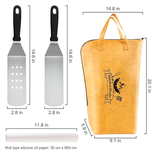 Perfectly Coordinated Griddle Kit: The meat blanket offers powerful storage and heat retention capabilities, accommodating multiple dishes or large portions while maintaining optimal serving temperatures; Two long-handled spatulas deliver efficient flipping and grilling performance, featuring ergonomic handles designed for fatigue-free extended use; Silicone-coated baking paper provides non-stick and breathable properties, ensuring intact food integrity and tender, juicy results
