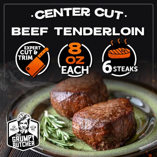 Specification: Grumpy Butcher Large Filet Mignon Steaks, 6 Pack (8 oz each) – Prime Steakhouse Size Beef Tenderloin Filet Steak Meat – For Delivery in Grumpy Butcher Meat Gift Packages Specials Option