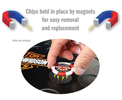 Harley-Davidson Bar & Shield Poker Chip Collector’s Magnetic Frame 48 Count is an eye-catching piece of art that enhances the looks of any true collector’s room. The frame is cut in the shape of the classic Harley-Davidson Bar & Shield with a beautifully printed Bar & Shield logo in the center. Chips not included. Fully magnetic allowing for easy poker chip removal and replacement. Holds all Harley-Davidson custom chips. Mounts on your wall and includes a pre-mounted metal sawtooth hanger for an effortless installation. What a great way to show off your collection! 48 chip capacity to collect from you favorite states, destinations and dealerships. H-D Bar & Shield logo imprinted in center. Chips are not included. Size: 18.75″ x 24″. Weight is about 4 pounds.