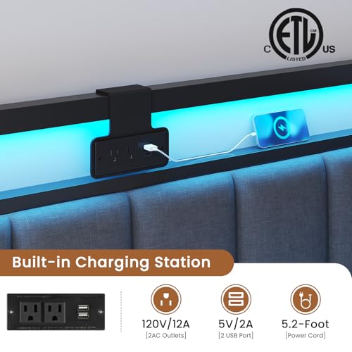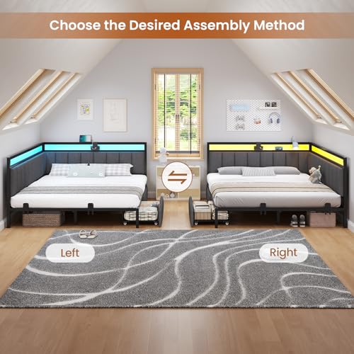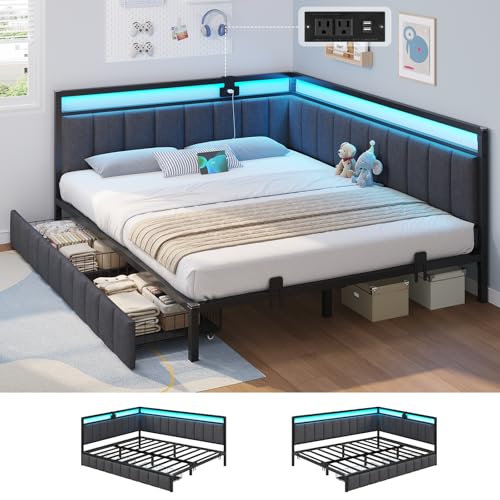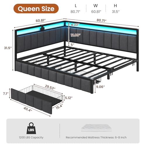 Specification: Hasuit Queen Corner Bed Frame with Storage Drawers, Queen Daybed with Line Fabric Upholstered Fence, Kids Bed Unit with LED Light and Charging Station, Modern Bed Frame Queen Size, Gray