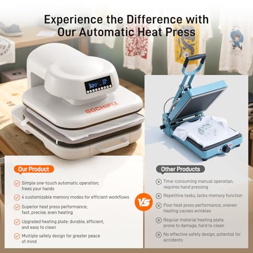 Specification: Heat Press Machine for T Shirts, 15″x15″ Auto Shirt Press Machine w/ 4 Memory Modes, 15 Mins Auto-Off, Precise Temp/Timer Control, Fast Even Heat for Sublimation, HTV, Heat Transfer Projects