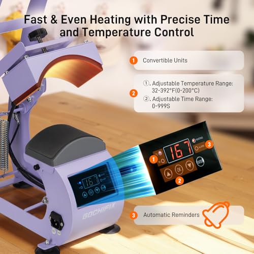 Precise Temp/Timer Control: The digital control panel helps you set and track temperature and time. With a range from 32-392℉ (0-200℃) and time from 0-999 seconds, the ceramic-coated aluminum heating plate provides fast, even heating. Scratch-resistant, rust-proof, non-stick, and easy to clean, delivering perfect transfer effects