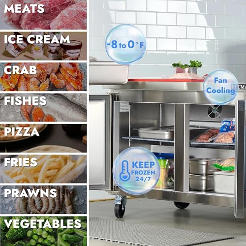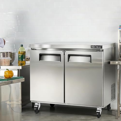 HECMAC 36″ Commercial Freezer, 9.68 Cu.ft Worktop Undercounter Fridge with 2 Solid Door, -8~0℉, 18-8 Stainless Steel Interior, ETL&NSF/ANSI 7 for Restaurant, Bar, Shop, Kitchen Use