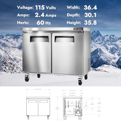 Specification: HECMAC 36″ Commercial Freezer, 9.68 Cu.ft Worktop Undercounter Fridge with 2 Solid Door, -8~0℉, 18-8 Stainless Steel Interior, ETL&NSF/ANSI 7 for Restaurant, Bar, Shop, Kitchen Use
