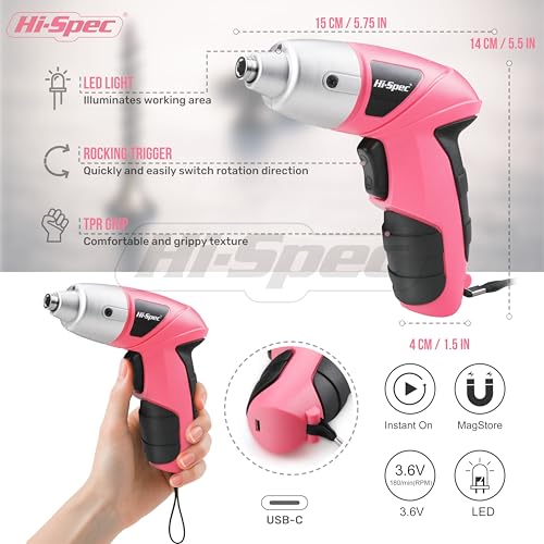 Specification: Hi-Spec Small Electric Screwdriver, Mini Drill Set, Rechargeable 3.6V Cordless Screwdriver with 26 Driver Bits, Power Tool for Small Projects & Home Use, Pink