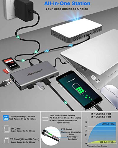 11 IN 1 USB C Docking Station: Supports 10/100/1000Mbps speeds. 1G movie in few minutes. With a rate of 5Gbps for USB 3.0 ports, SD and TF card slot included