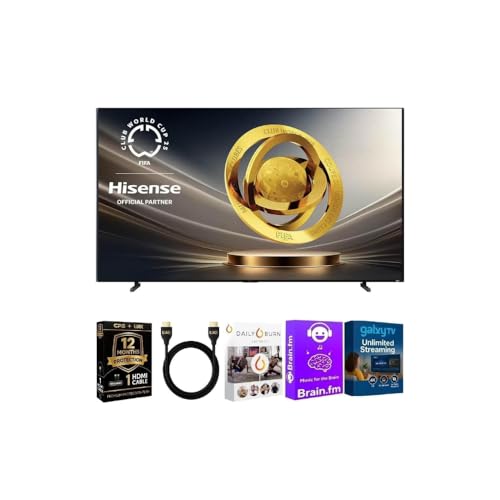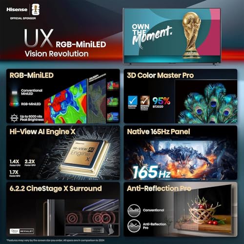 Experience next-generation home cinema with the Hisense 116-Inch Class UX Series 4K UHD QLED RGB Mini LED Smart Google TV. Designed for ultimate immersion, it features Quantum Dot Color and RGB Mini LED backlighting that deliver exceptional brightness, over a billion colors, and precise local dimming for lifelike contrast. Dolby Vision and HDR10+ create a dynamic, cinematic image, while Dolby Atmos and DTS:X audio fill the room with theater-quality sound. Powered by Google TV, you’ll access your favorite streaming apps, movies, and shows effortlessly with hands-free Google Assistant voice control and built-in Chromecast. Equipped with Wi-Fi 6 and Bluetooth 5.3, it ensures smooth, lag-free streaming and device connectivity. The package includes a high-speed HDMI cable, premium screen cleaner, and streaming bundle for instant setup. With its sleek, ultra-thin VA QLED panel and modern design, the Hisense UX transforms any space into a spectacular 4K entertainment hub.