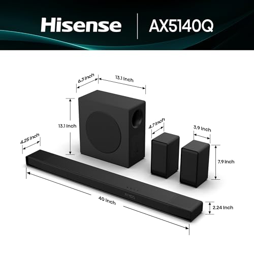 Specification: Hisense AX5140Q 5.1.4Ch Sound Bar with Wireless Subwoofer, Dolby Atmos, DTS:X, Bluetooth 5.3, Roku TV Ready, HDMI/AUX/ARC/Optical/USB, EzPlay, 7 EQ Modes, Hi Concerto, Room Calibration