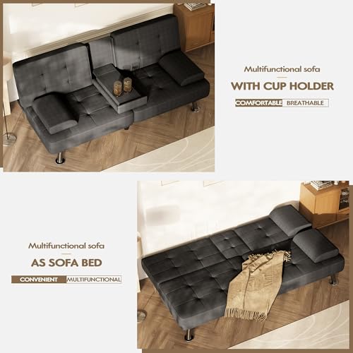 [Dual cup holders]: The futon sofa is conveniently positioned cup holders ensure that your drink is within easy reach, perfect for leisurely enjoying your favorite beverage. It can also be hidden away when not in use, keeping the sofa neat and beautiful.