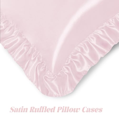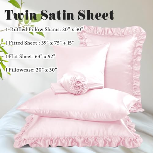 Homiest Ruffled Satin Sheets Twin Size 4pc Set – Blush Pink Bed Sheet Set with 15 Inch Deep Pocket Fitted Sheet, 1 Flat Sheet, 1 Ruffled Pillow Shams & 1 Pillowcases, Similar to Silk Sheets