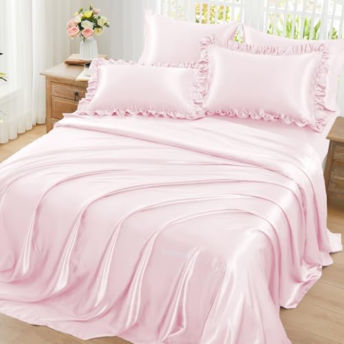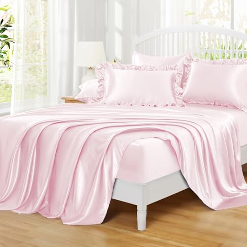 Specification: Homiest Ruffled Satin Sheets Twin Size 4pc Set – Blush Pink Bed Sheet Set with 15 Inch Deep Pocket Fitted Sheet, 1 Flat Sheet, 1 Ruffled Pillow Shams & 1 Pillowcases, Similar to Silk Sheets