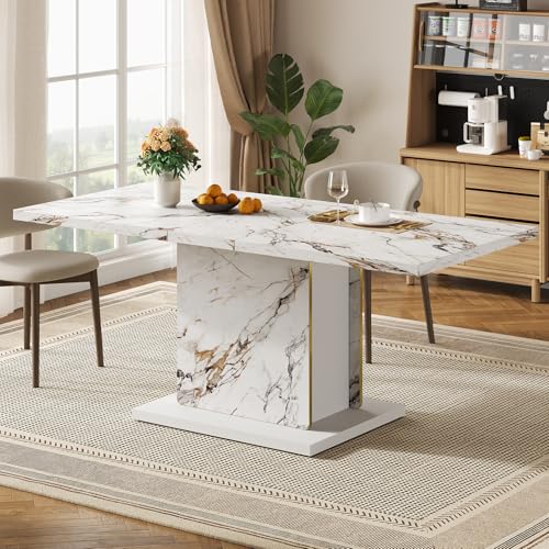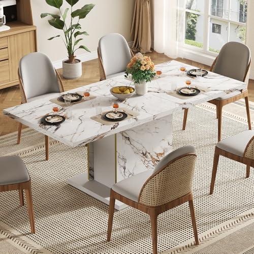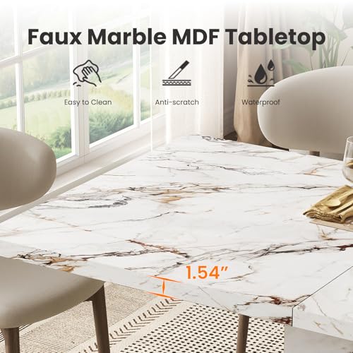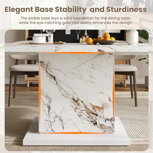 Modern Elegant Design: HOMISSUE dining table features an exquisite faux marble pattern on its tabletop, with natural, vivid and layered textures that endow this rectangle dining table with unique visual appeal. Its base is subtly accented with gold trim, enhancing sophistication in details. With a simple and grand overall design, it adds a fashionable style to the dining space.