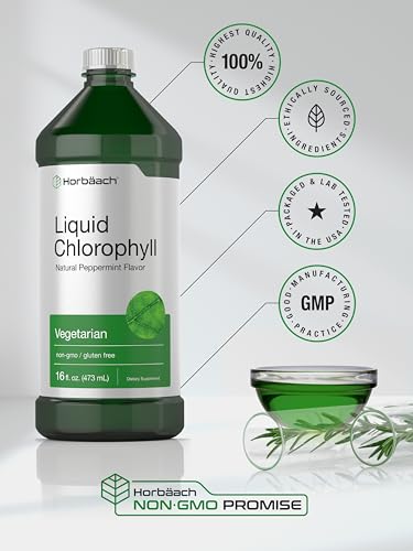 Specification: Horbäach Chlorophyll Liquid Drops | 100mg | 32 oz (2 x 16 oz Bottles) | Natural Peppermint Flavor | Vegetarian, Non-GMO, Gluten Free Supplement