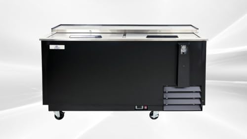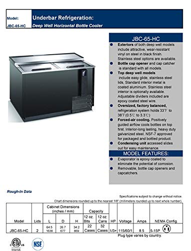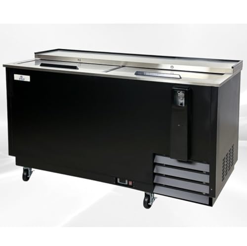 Horizontal Bottle Cooler Deep Well 65″ Width NSF Certified Commercial beer bottle Refrigerator Black 33°-38°F Top-Loading SPACIOUS INTERIOR: This bottle cooler boasts 12.6 cu. ft. of storage space so you have plenty of room for a wide assortment of drinks. EASY TO CLEAN: This unit is designed for outstanding durability to ensure that it withstands service through even your busiest days and nights. It features a black coated steel exterior that gives the cooler an attractive aesthetic in any environment, while a painted aluminum interior makes cleaning a breeze! DURABLE AND SAFE: This unit is designed for outstanding durability to ensure that it withstands service through even your busiest days and nights. It features a black plastic coated steel exterior and a painted aluminum interior. Three stainless steel lids open and close with ease, making for easy drink retrieval. Because they lock, the lids also secure your beverage selection, making sure that your supply is always safe. ECO-FRIENDLY REFRIGERANT: This cooler guarantees optimal performance by operating with a 1/4 hp refrigeration system that circulates environmentally-friendly R290 refrigerant to maintain temperatures from 33 to 40 degrees Fahrenheit. R290 refrigerant has an ozone depletion potential (ODP) of 0 and a global warming potential (GWP) of 3, making it an environmentally-responsible choice for your business. EASY TO OPERATE: You can adjust the cooler with the digital temperature controller as needed, and maintain the unit with its auto-defrost function. For your utmost convenience, 2 bottle opener / cap catchers are included with the unit. Just grab a beer, use the opener, and serve! FULLY INSULATED: The foamed-in-place polyurethane insulation helps to add structural rigidity and maintain proper internal temperatures.