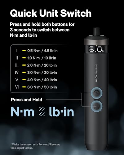 Specification: HOTO PixelDrive Electric Screwdriver, Smart Display, 6 Torque Settings, 0.5 to 6 N·m, 1/4” Hex 30 Bits, LED Light, 2000 mAh Rechargeable Cordless Screwdriver Set for Electronics, Home Repair
