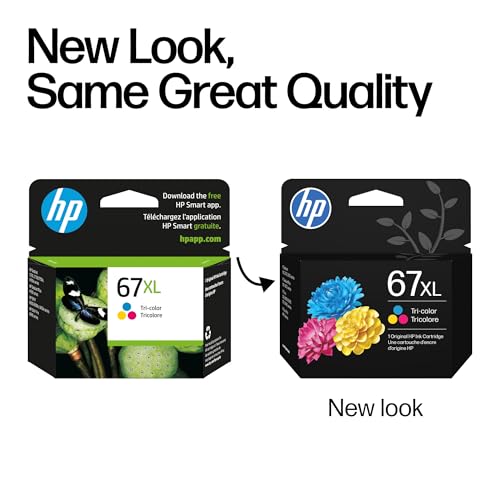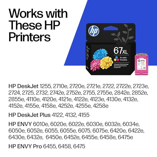Specification: HP 67XL Tri-Color High-Yield Ink Cartridge Printers | Works with Printer Series: DeskJet 1255, 2700, 4100; Envy 6000, 6400 | Eligible for Instant Ink | 3YM58AN