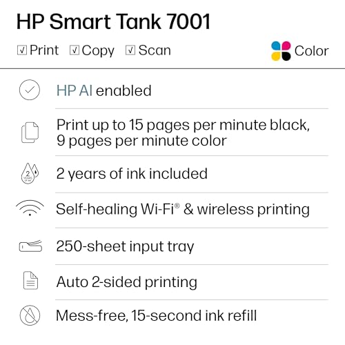 Specification: HP Smart Tank 7001 Wireless All-in-One Ink Tank Printer, Scanner, Copier with 2 Years of Ink Included, Best-for-Home Office, Cartridge-Free Refillable, AI-Enabled (28B49A)