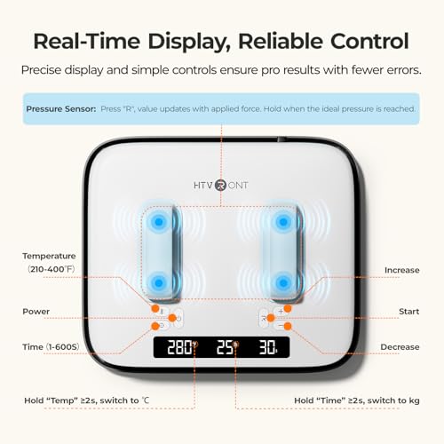 【Real-Time Display Ensures Accurate Pressure Control】Equipped with a built-in pressure sensor, HTVRONT heat press monitors and displays pressure data in real time. The clear digital screen shows pressure, time, and temperature, allowing you to make precise adjustments and ensuring consistent heat transfer and professional results across different materials with the heat press machine for t shirts every time