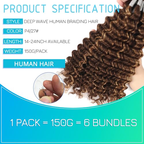 Human Braiding Hair 18 Inch 6 Bundles Human Hair Braiding Hair No Weft Deep Wave Bulk Human Hair for Braiding Hair Extensions for Boho Braids Wet and Wavy 150g P4/27#