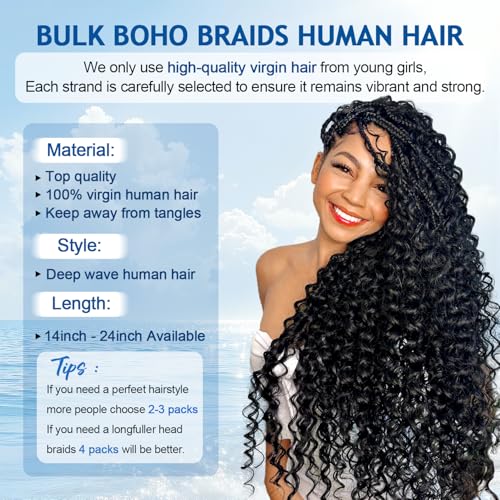 Specification: Human Braiding Hair for Boho Braids 110g Curly Boho Hair for Braiding Knotless 12A Wet and Wavy Bulk Bohemian 3 Bundles/Pack Deep Wave 100% Human Hair Extensions Natural Color 16inch