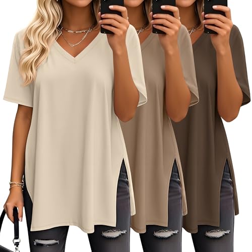 Huukeay 3 Pack Oversized Shirts for Women V Neck Workout T Shirt Casual Side Split Tee Short Sleeve Loose Tops Tunic Tops