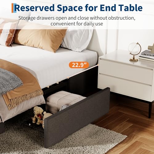 Specification: IDEALHOUSE Queen Size Bed Frame with 3 Large Storage Drawers, Fabric Upholstered Platform Bed, Wooden Slats Support, No Box Spring Needed, Noise Free, Easy Assembly, Grey