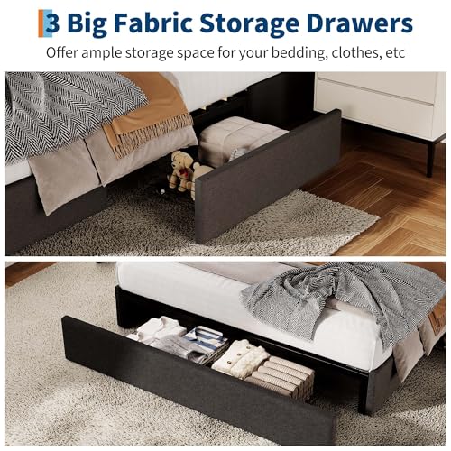 IDEALHOUSE Queen Size Bed Frame with 3 Large Storage Drawers, Fabric Upholstered Platform Bed, Wooden Slats Support, No Box Spring Needed, Noise Free, Easy Assembly, Grey