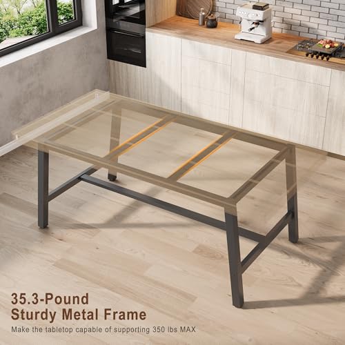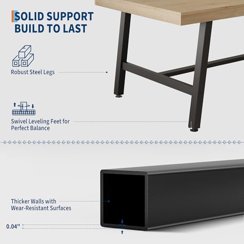 [Sturdy Metal Frame & Reinforced Support]: Built with heavy-duty 2” x 2” steel legs and three hidden load-bearing bars beneath the tabletop, this wood dining table can hold up to 300 lbs. The T-shaped frame ensures excellent stability and durability, while the black metal finish adds an elegant industrial touch to your dining room décor.