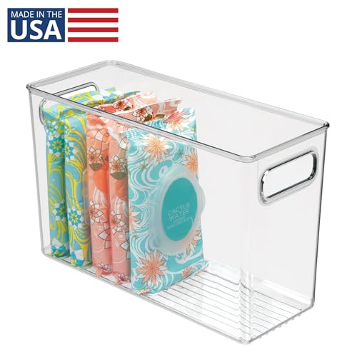The iDesign Slim Bathroom Storage Bin with Handles keeps your lotions, creams, serums, and toiletries organized and easy to find. Its narrow footprint fits perfectly on counters, under sinks, or inside tight cabinets to help maximize space. The spacious, open-top design grants immediate reach-in access to everyday items, always keeping your belongings easily accessible. Its transparent construction offers unobstructed views for instant visibility, and two comfortable carry handles facilitate easy transport to make organizing a breeze. Whether you’re organizing bathroom products, makeup, skincare, or hair care items, this clear tall storage bin combines style, functionality, and convenience in one sleek design.