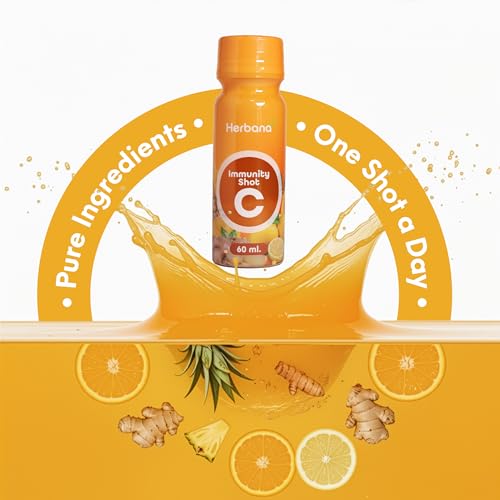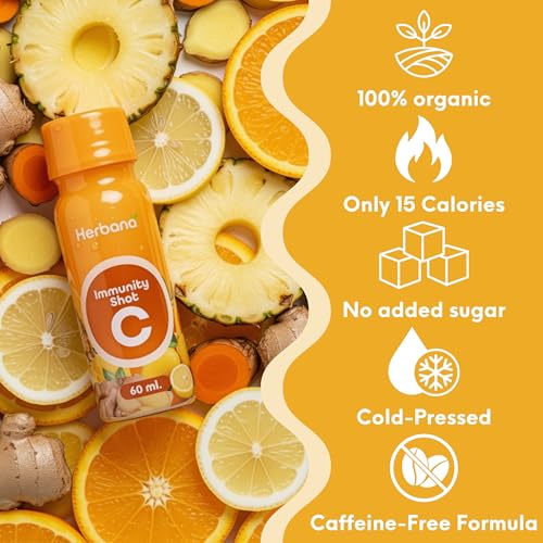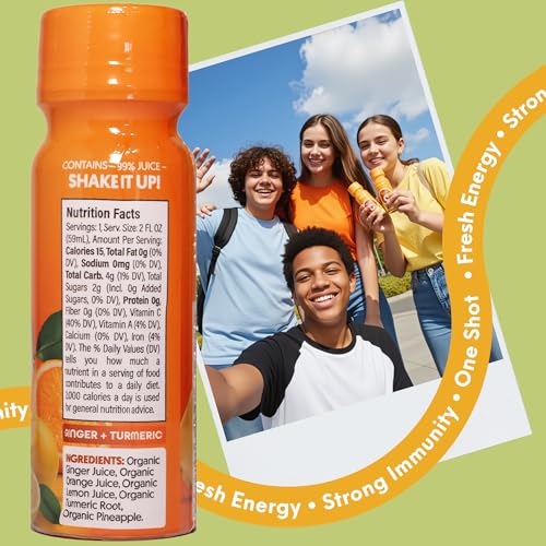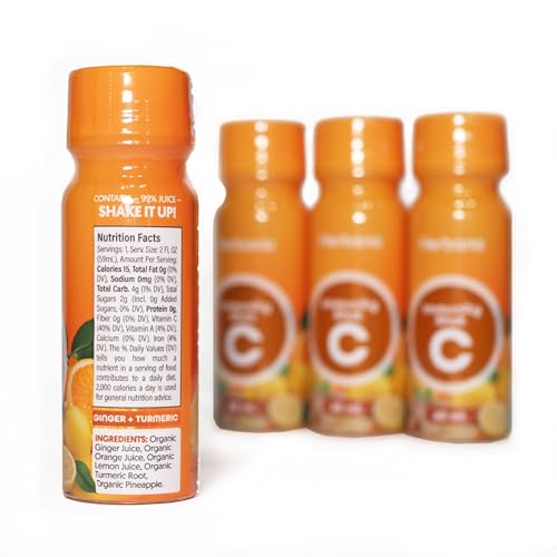 Boost your wellness routine with these convenient immunity shots featuring a powerful blend of organic cold-pressed juices. Each 2-ounce serving combines organic ginger, turmeric, orange, pineapple, and lemon juice to support immune and digestive health naturally. The shots contain 99% pure juice with no added sugars or artificial ingredients, delivering essential nutrients including 40% daily value of Vitamin C while containing just 15 calories per serving. Each 60ml bottle preserves the potency of its natural ingredients, offering a quick and easy way to incorporate beneficial nutrients into your daily regimen. With 4g of total carbohydrates per serving and a caffeine-free formula, these shots complement a balanced lifestyle. Simply shake well before consuming and refrigerate after opening. The shots are carefully crafted in the USA and require refrigeration to maintain freshness.
