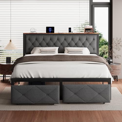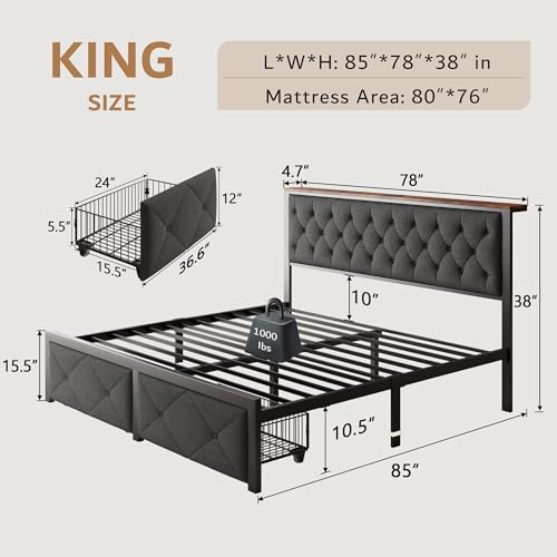 Specification: iPormis King Bed Frame with 2 Storage Drawers, Linen Upholstered Headboard Platform Bed with Charging Station, No Box Spring Needed, Metal Slats Support, Noise-Free, Easy Assembly, Grey
