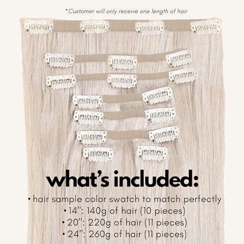 DIFFERENT LENGTHS AND WEIGHTS FOR CUSTOM USE + EASY CARE – Each set of clip on extensions human hair comes with a range of weft sizes for coverage based on your needs. The 14″ set includes 100g of hair (7 pieces), the 20″ set has 160g (8 pieces), and the 24″ set offers 200g (10 pieces). CARE: Brush before & after each use, starting at the ends and working up. Wash only when needed using a gentle sulfate-free shampoo, then let air dry. Always use a heat protectant before styling.