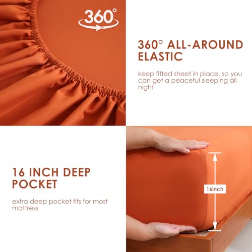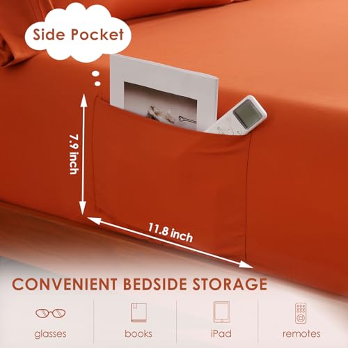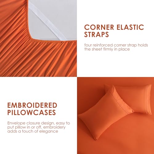 JSD Burnt Orange Queen Sheet Set with Side Pocket Corner Straps, 4 Piece Soft Microfiber Bed Sheets Extra Deep Pocket