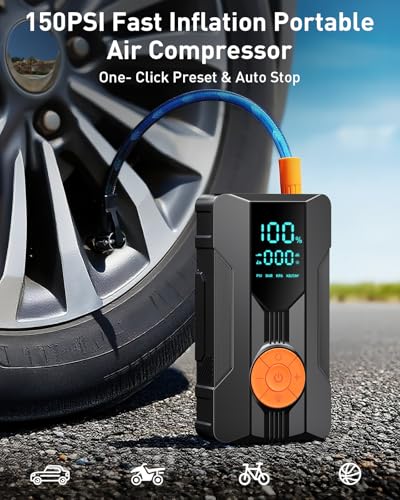 Specification: Jump Starter with Air Compressor, Car Battery Jump Starter (8.0 Gas/7.0L Diesel), Battery Jumper Starter Portable Jump Box, 12V Portable Car Jump Starter with Tire Inflator, LED Light
