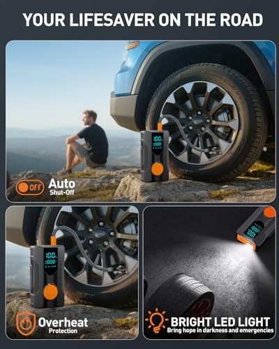 【5 in 1 Multifunction Tool】 More than a car jump starter portable, this jump starter power pack also works as a portable car battery charger and car battery charger jump starter. Dual USB ports keep devices powered, LED flashlight offers 3 modes, and the LCD screen shows power and pressure clearly. It is an ideal all-in-one tool for road trips, outdoor adventures, and emergencies.