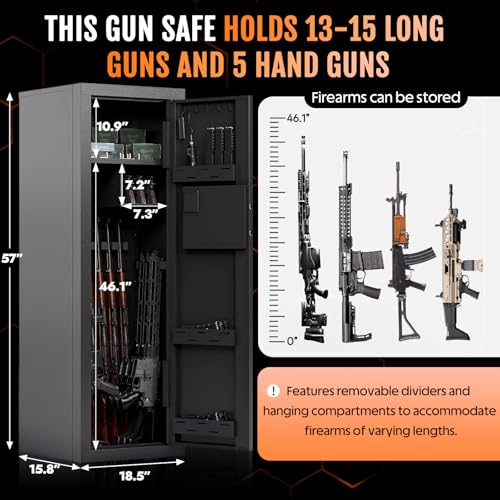 Large Capacity Biometric Fingerprint Gun Cabinet:The large gun safe easily accommodates 13–15 firearms of various types (such as rifles, shotguns, and other long guns). The removable racks allow you to adjust according to the height of your guns, ensuring each one is stored securely and in an organized manner. The safe can store firearms (with or without scopes) up to a maximum height of 45.5 inches. Please note: If a firearm exceeds 45.5 inches in height, the interior shelves and hanging cabinet must be removed; otherwise, the gun cannot be stored properly.