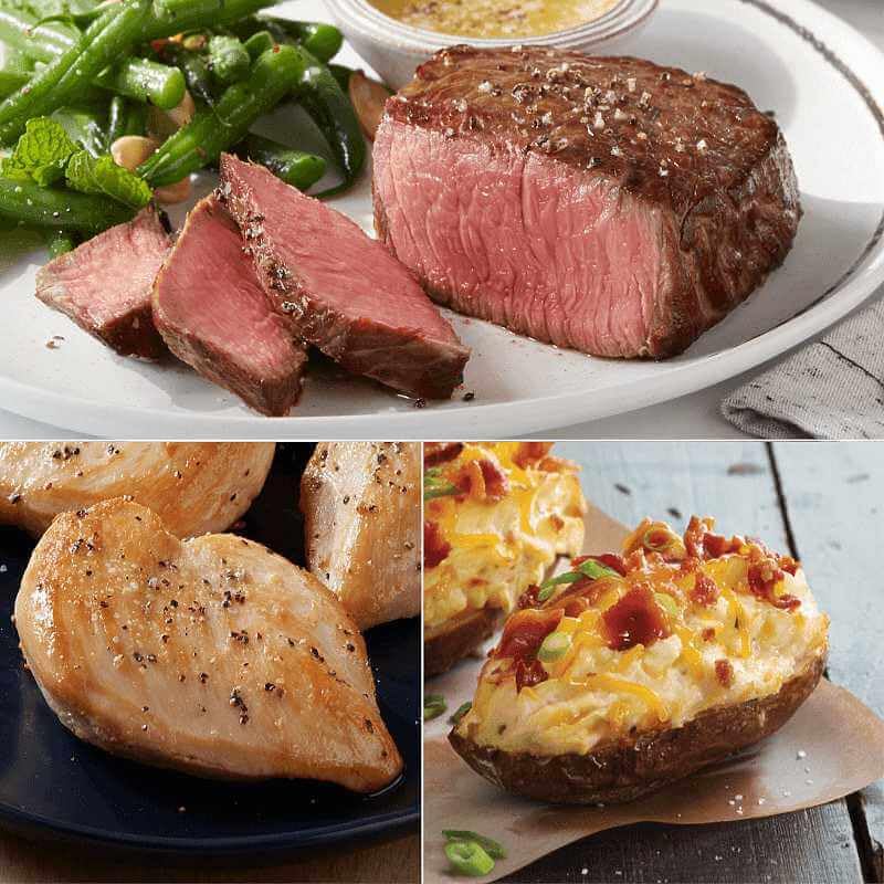 Specification: Kansas City Steak Company Patio Pack with 4 Top Sirloin Steaks, 4 Boneless Tender Chicken Breasts, and 4 Gourmet Twice Baked Potatoes with Cheddar & Bacon/Includes Cooking Instructions