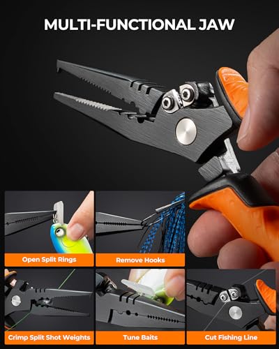 Tough Forged & Corrosion-Resistant 7″ Fishing Pliers – Crafted from S45C carbon steel with a fluoropolymer coating, the 7″ fishing pliers deliver exceptional durability and corrosion resistance. The non-slip TPR handles ensure effortless one-handed use, while the coiled lanyard and aluminum carabiner prevent loss. Equipped with a multi-functional jaw, they open split rings, remove hooks, crimp weights, tune baits, and cut lines with ease. Waist carry with the TPR sheath ensures quick access.