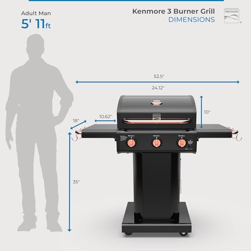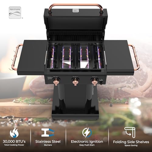 Specification: Kenmore 3-Burner Gas Grill | Foldable Side Tables, Cast Iron Cooking Grates, Warming Rack, Hooks for BBQ Grilling Tools, Propane Gas Barbecue Grill, 30,000 BTUs, Black with Copper Accent
